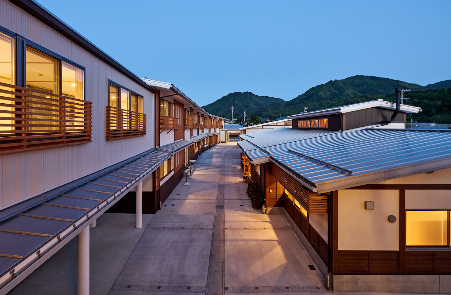 建物は切妻型の屋根で統一し、深い軒を出したデザインとしています。自然に囲まれた里山と呼べる地域に違和感なく溶け込み、屋根の連なりが山形における里山の風景をつくりだしています。
