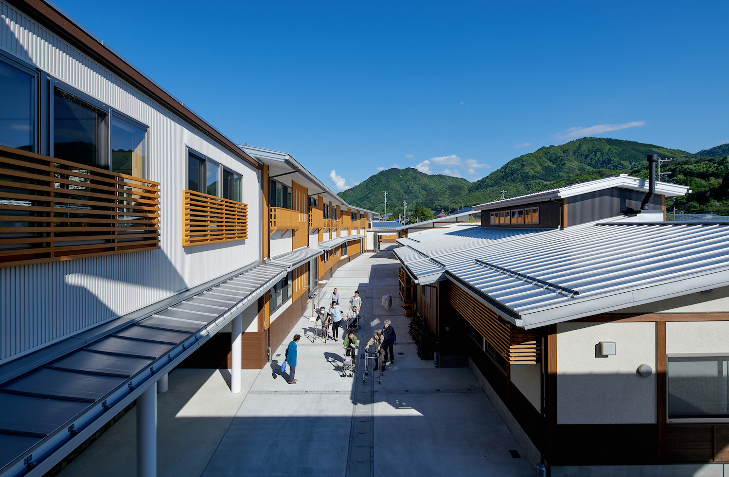 私たちはひとつの施設内で介護サービス機能が完結する複合型の介護福祉施設「きらめきの里」を計画しました。本施設は特別養護老人ホーム、ショートステイ、デイサービス(一般・認知症)、認知症高齢者グループホーム、小規模多機能型居宅介護の6つの事業所から構成されています。それらの機能を持つ5つの建物を、敷地の中央に設けた「ふれあいとおり」と名付けた外部通路に沿って配置した分棟型の施設構成としています。各用途の建物が連携しあい、「福祉のまち」として賑わいをつくり出す事を目指しました。