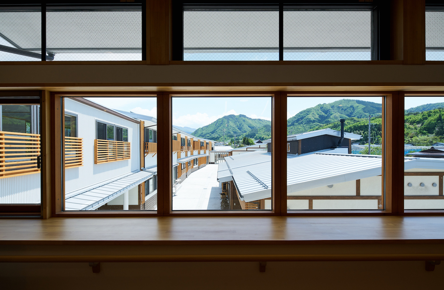 建物は切妻型の屋根で統一し、深い軒を出したデザインとしています。自然に囲まれた里山と呼べる地域に違和感なく溶け込み、屋根の連なりが山形における里山の風景をつくりだしています。